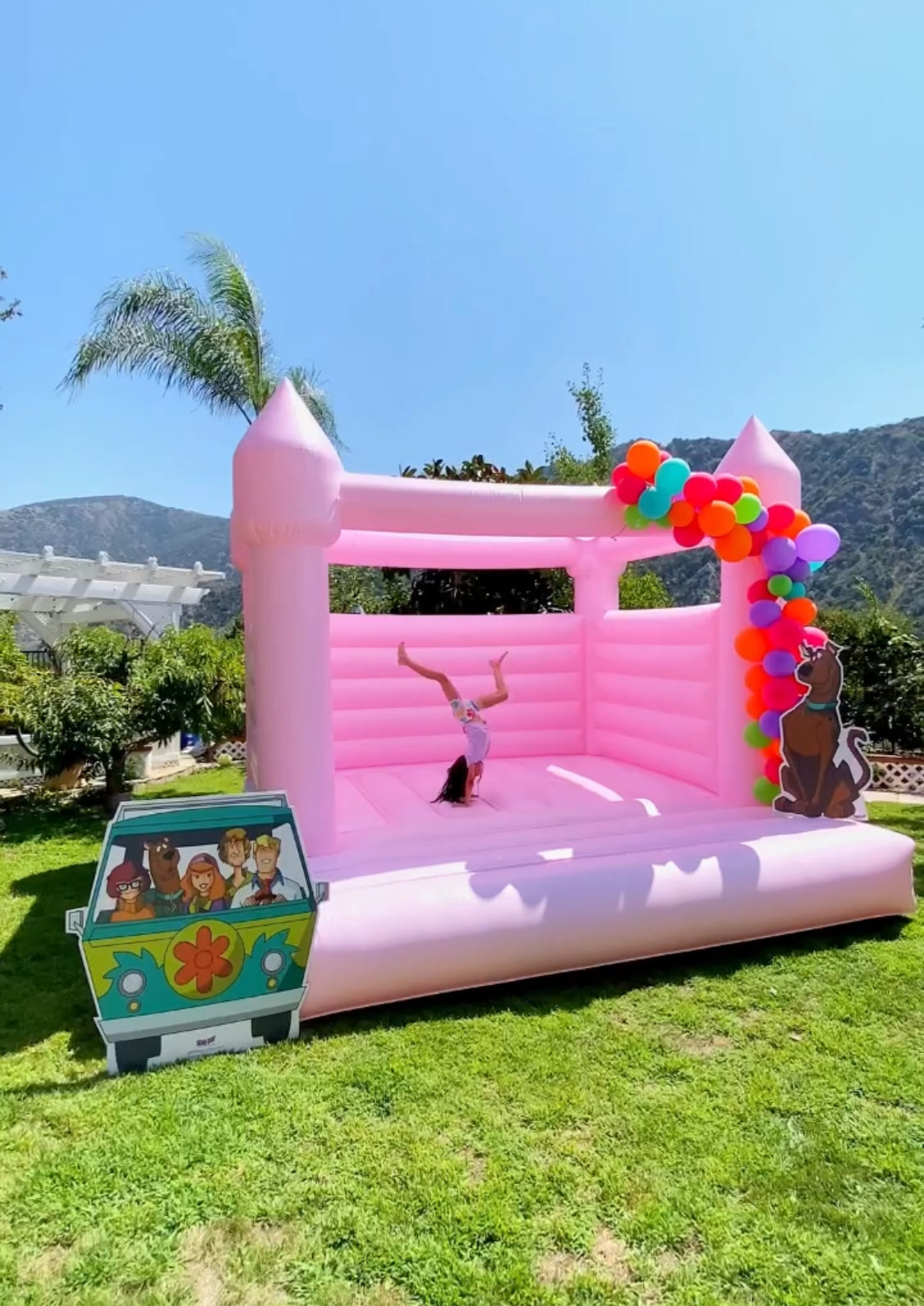 The Rose Castle includes accessories such as a white tarp, 50 ft. extension cord, and blower. This bounce house is recommended for all ages.